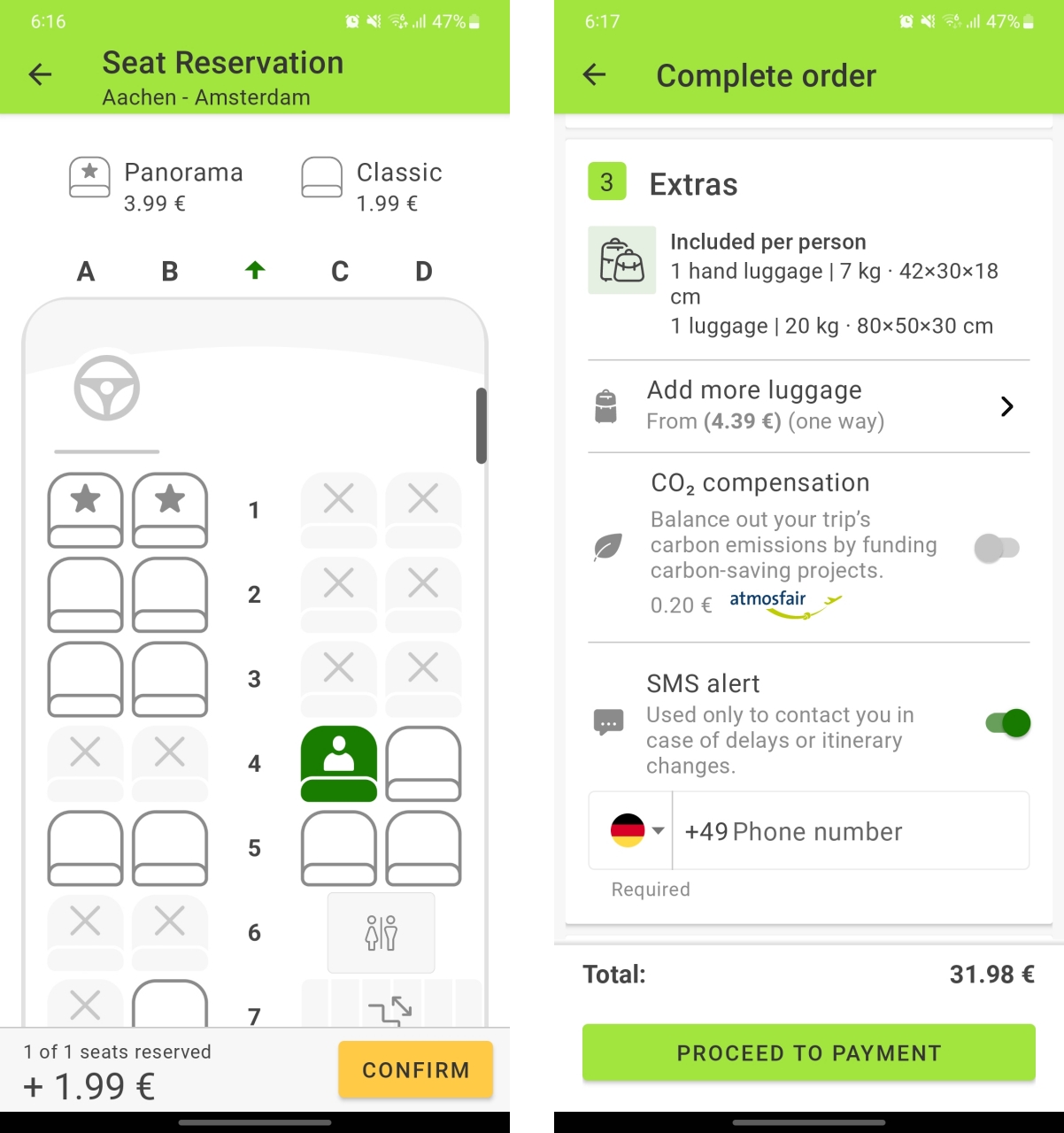 좌석 지정은 안해도 되지만 저희는 아이가 함께하는 여행이어서 3자리를 지정했습니다. 일반 지정은 1.99유로가 추가로 부가됩니다.