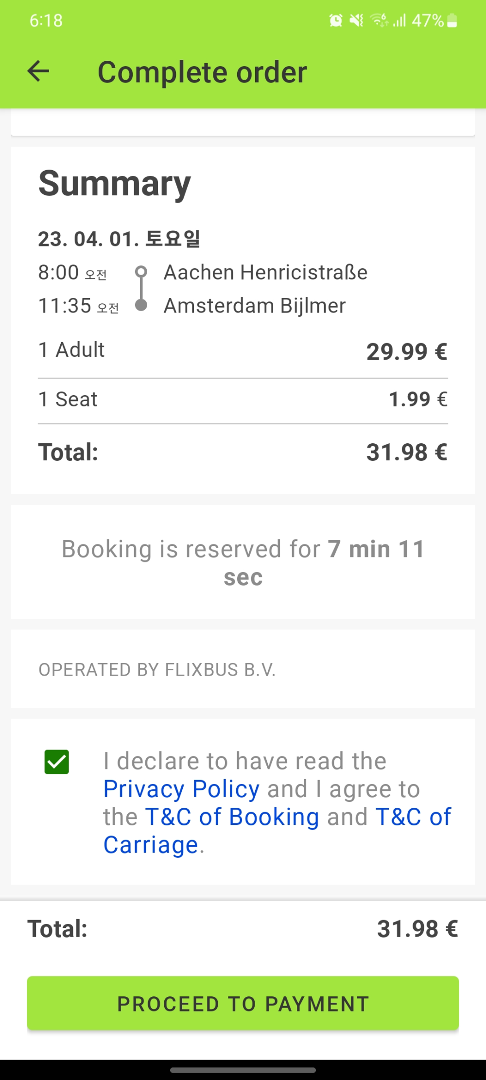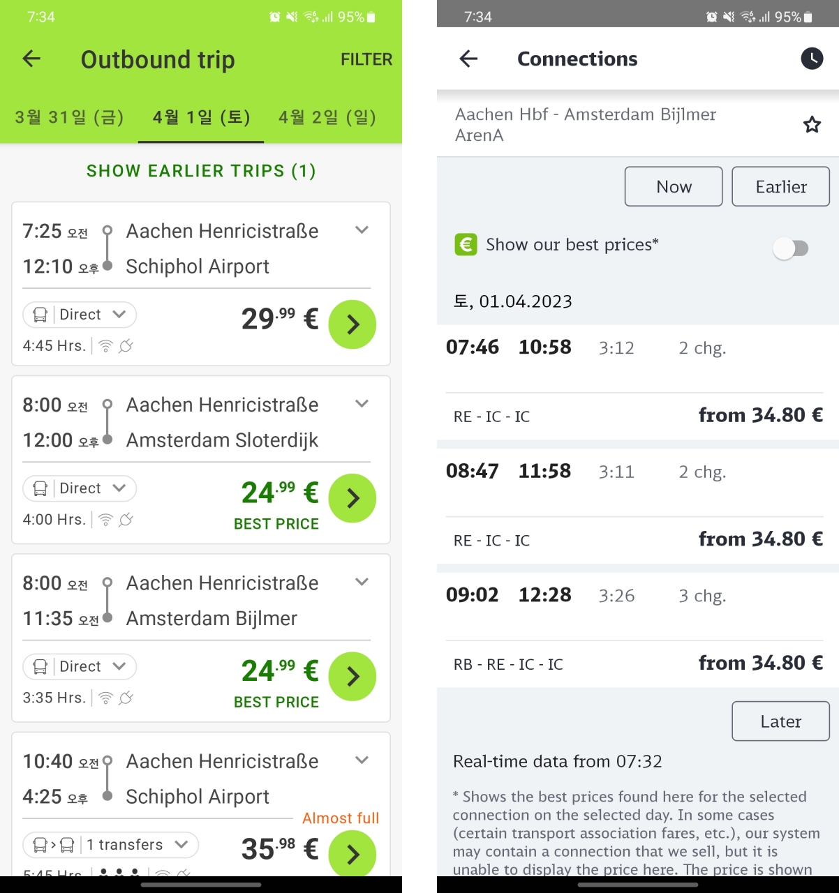 → 출발시간, 도착지 세부 위치 선택저는 당시 8시 출발 11:35분 Amsterdam Bijlmer 도착으로 선택했습니다. Amsterdam도 Schiphol 공항까지 포함하면 3개 도착 장소가 있습니다. 해당 도착지가 위치상 어디인지 확인하고 선택하시면 됩니다.