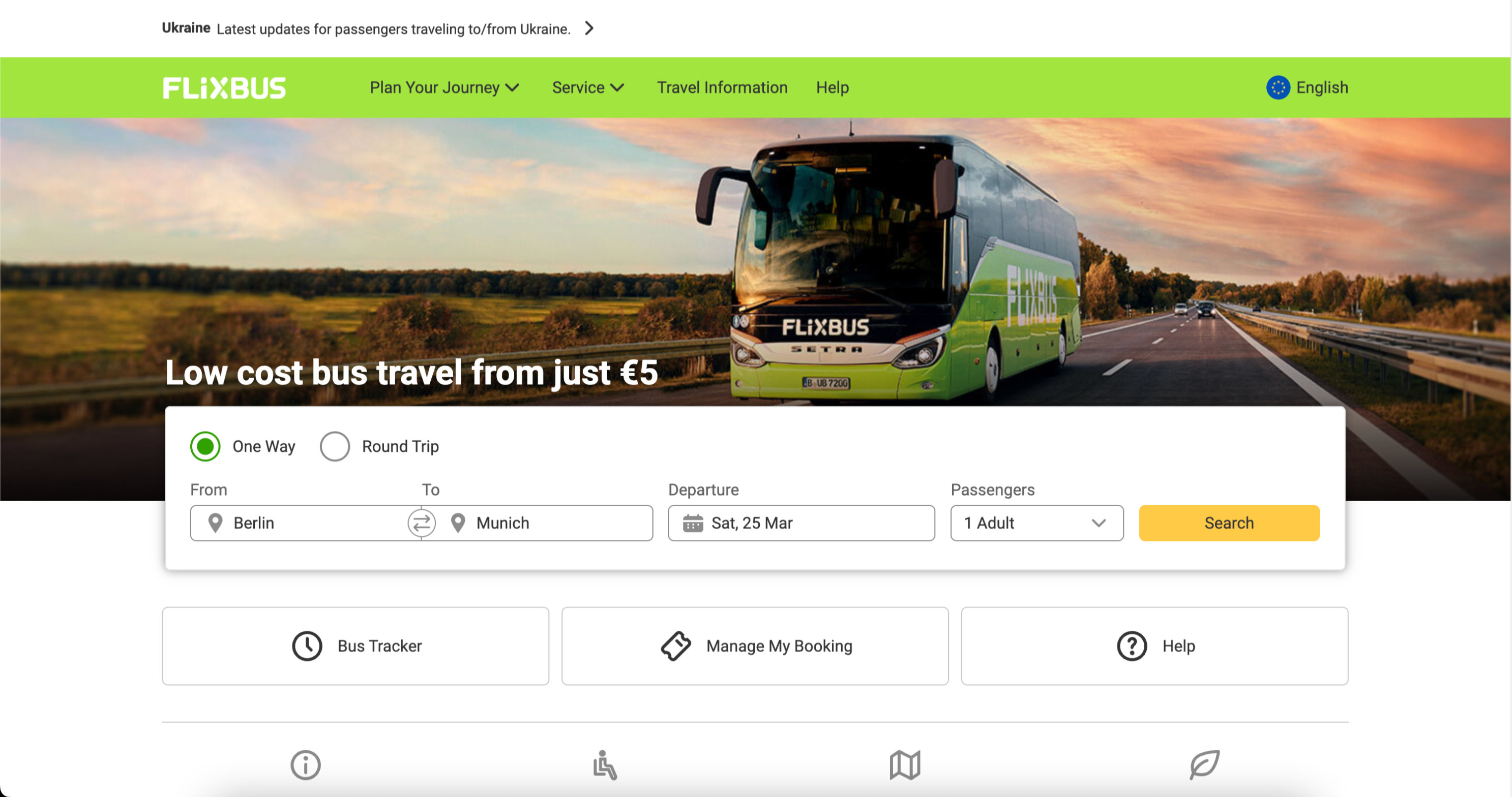 https://global.flixbus.com/현지에서라면 오른쪽 위에 있는 언어를 유로깃발 모양의 아이콘인 English로 선택합니다. 이후에 출발지 등 입력 사항은 스마트폰 앱과 동일합니다.
