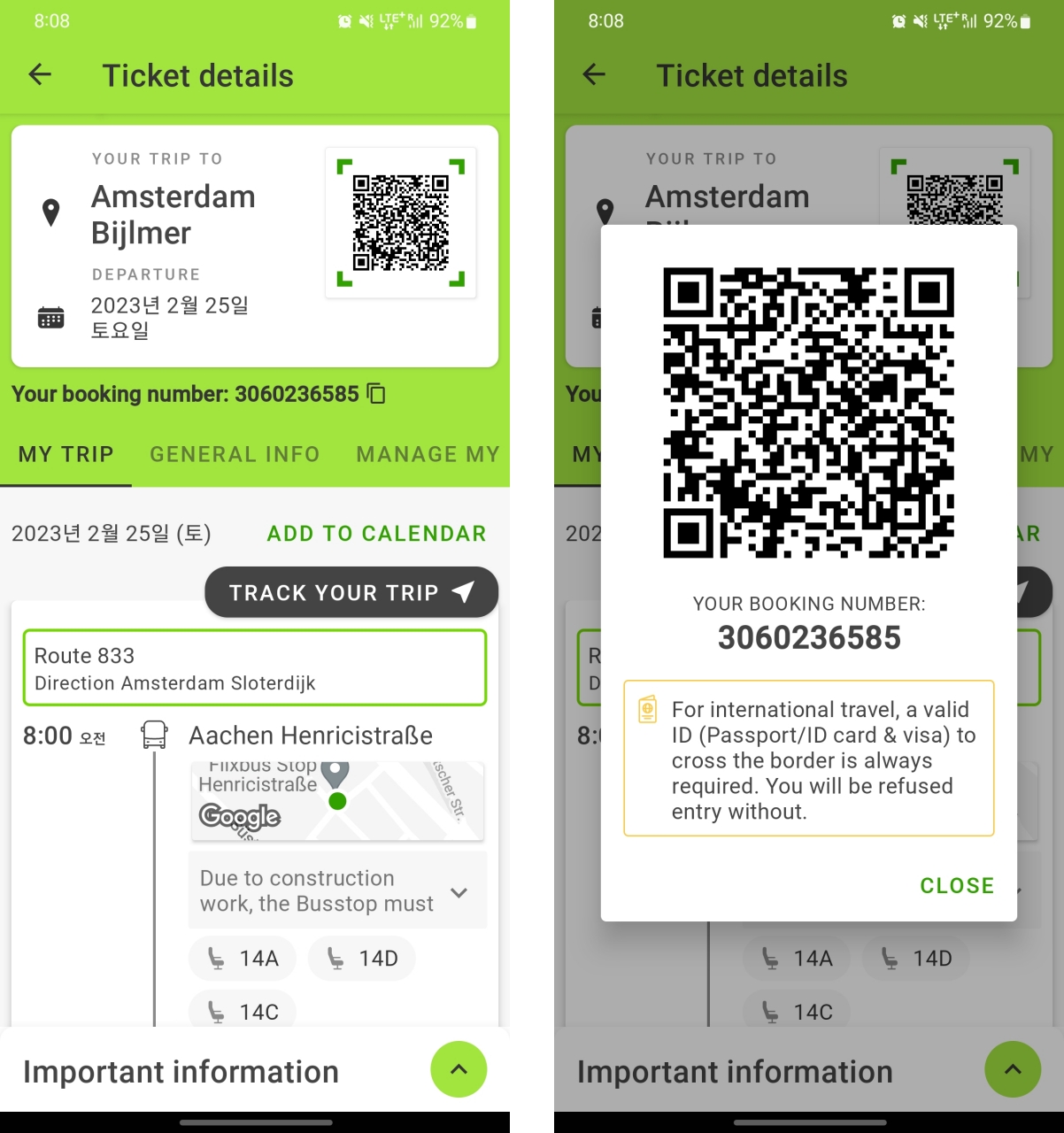 여권은 유럽내 국가간 이동의 경우 운전기사가 확인을 요구하는 경우가 있습니다. 버스번호와 정거장 위치는 Flixbus 앱에서 예매내역에 보면 확인이 가능합니다.