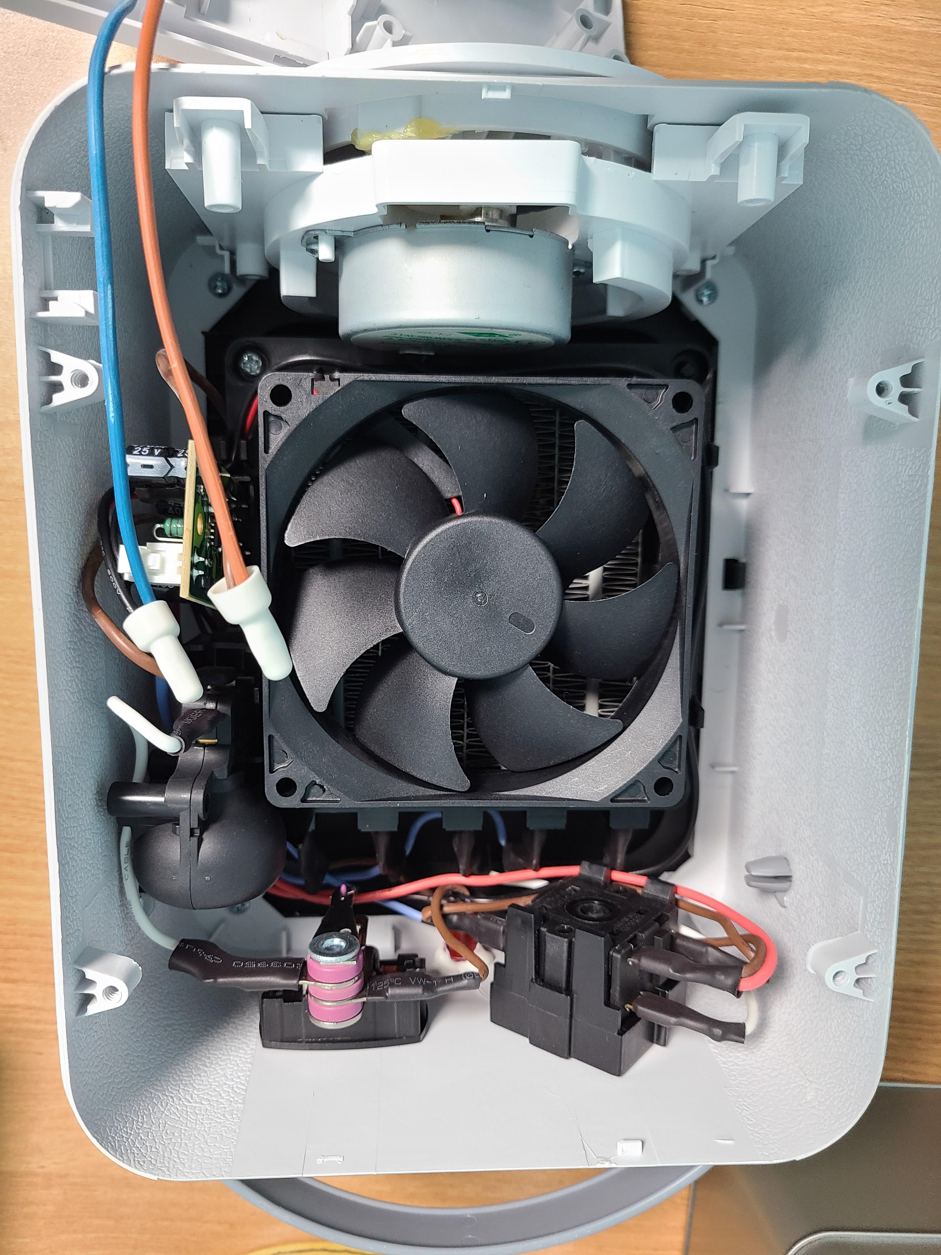 PTC 히터와 송풍 팬, 온도조절기, 동작스위치, 아래쪽 회전 모터, 12V전압 변환기, 기울어짐 감지 스위치? 등입니다.