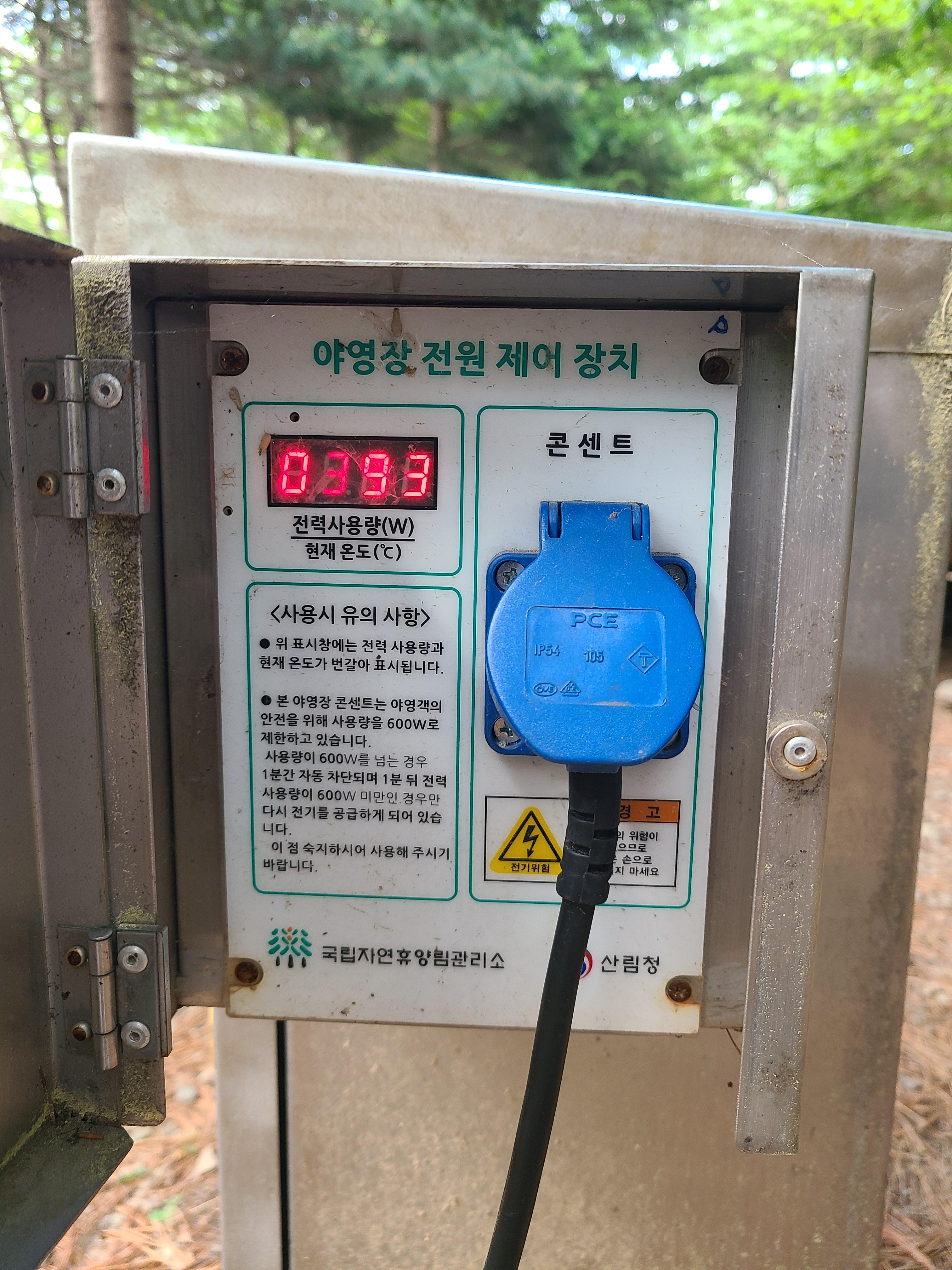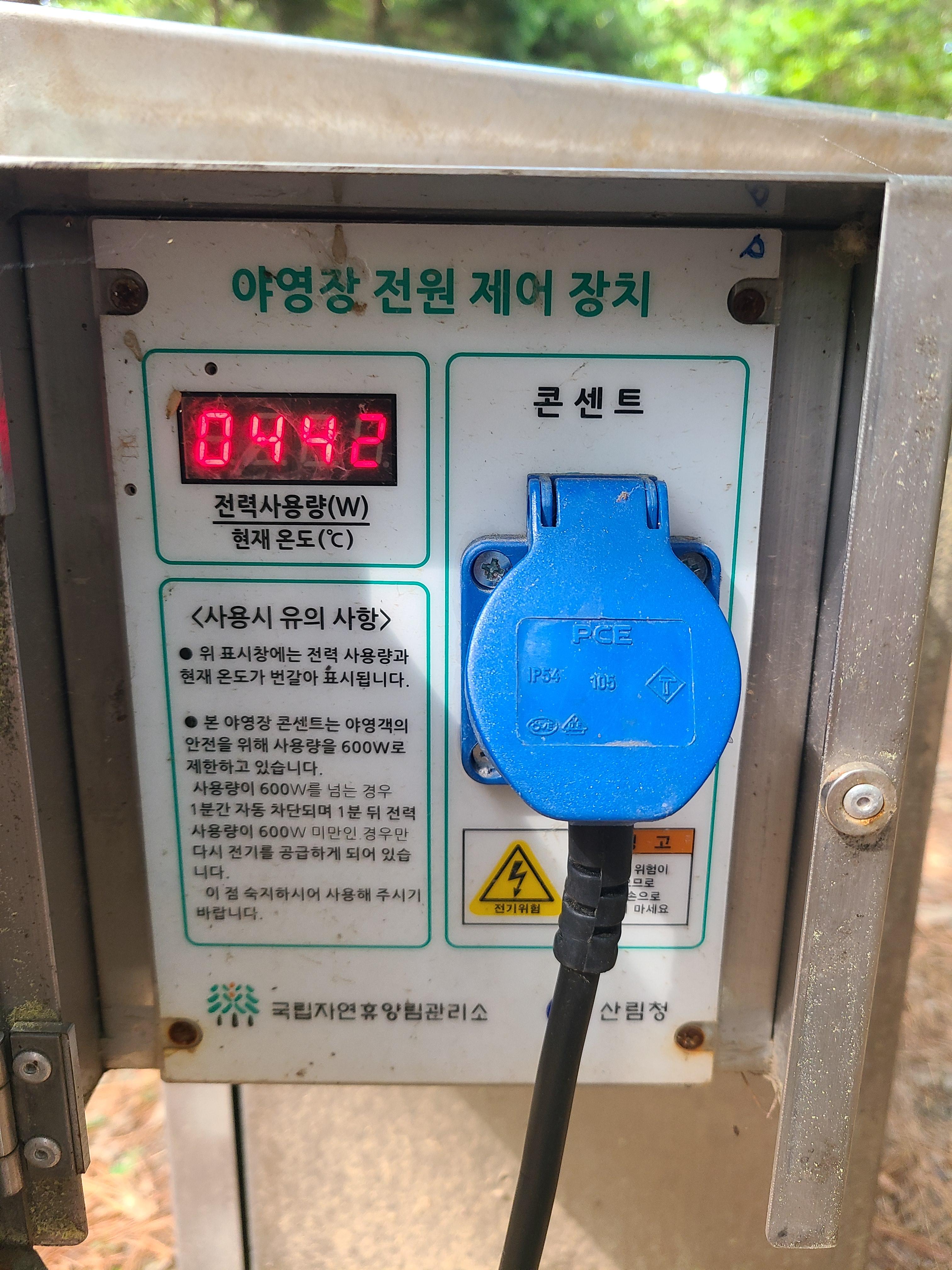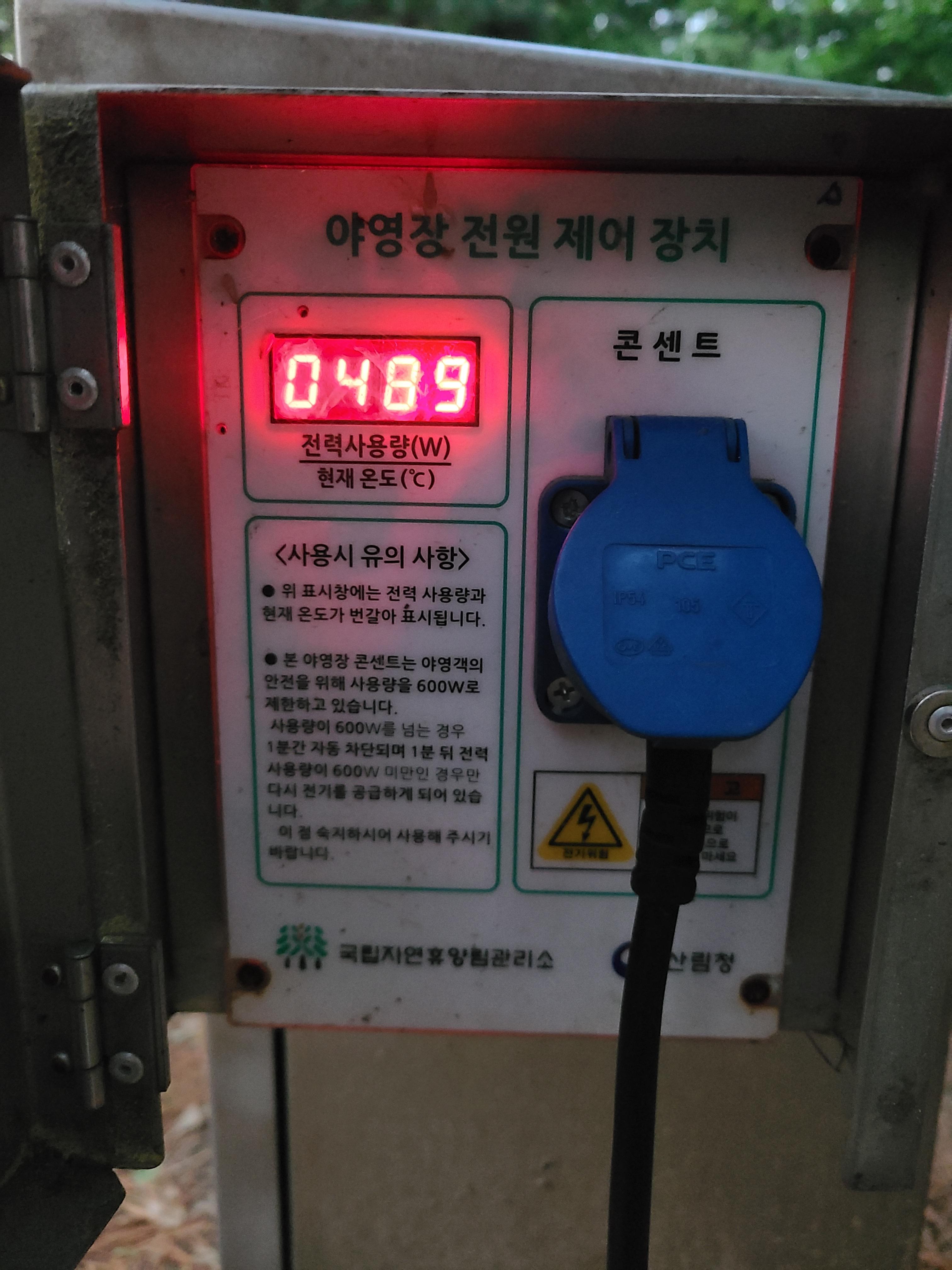 2단까지 올렸더니 648W까지 올라갑니다. 이번엔 다행히 차단되거나 경고음은 들리지 않았습니다. 유명산 자영휴양림은 전력량 10% 정도는 여유가 있는듯합니다.