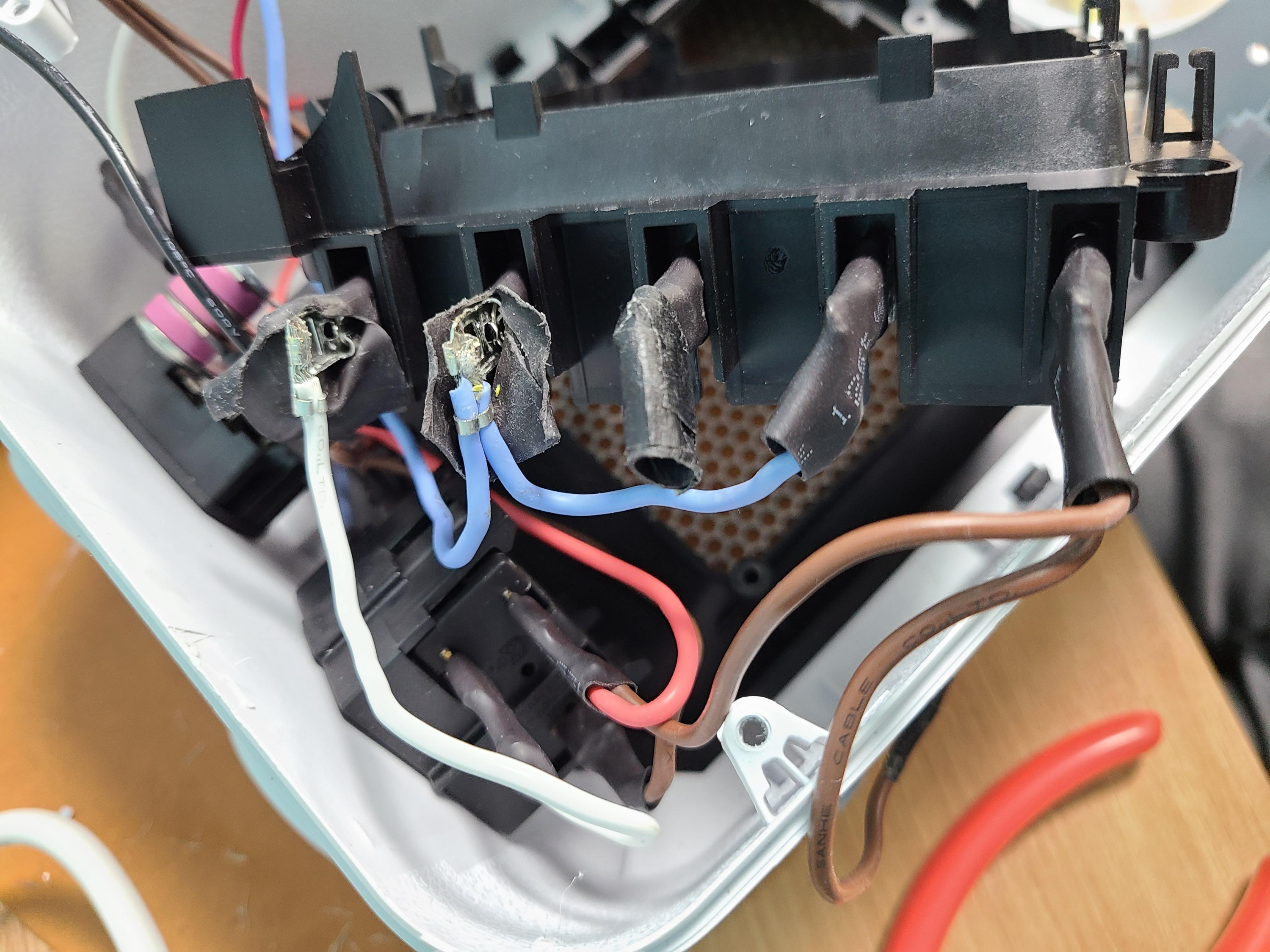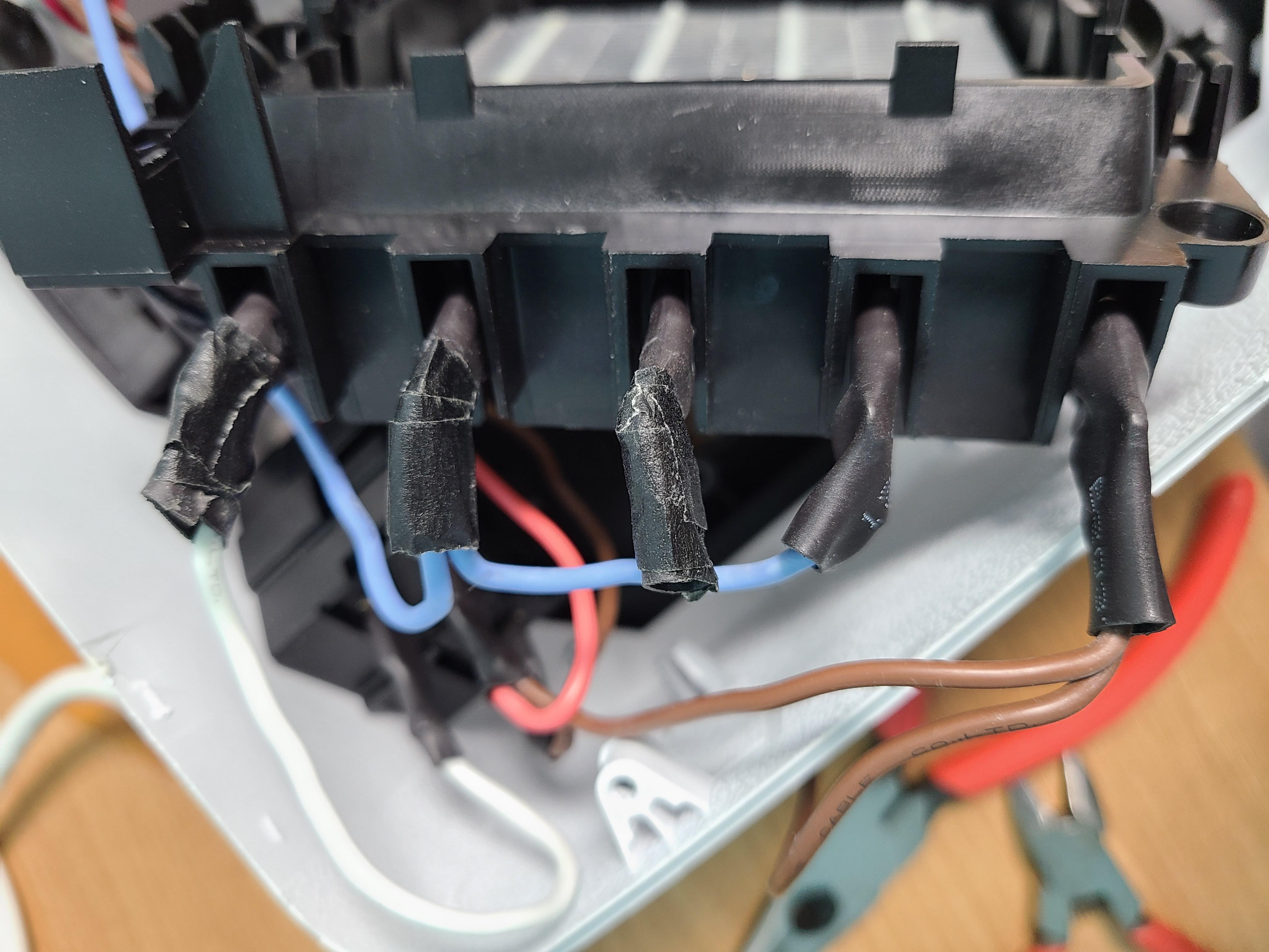 1번과 2번 단자의 수축튜브를 벗기고 케이블을 빼내려 했는데 너무 꽈 물려있어서 그냥 잘라버렸습니다. 그리고는 쇼트나지 않도록 테이프로 잘 감아주고요.