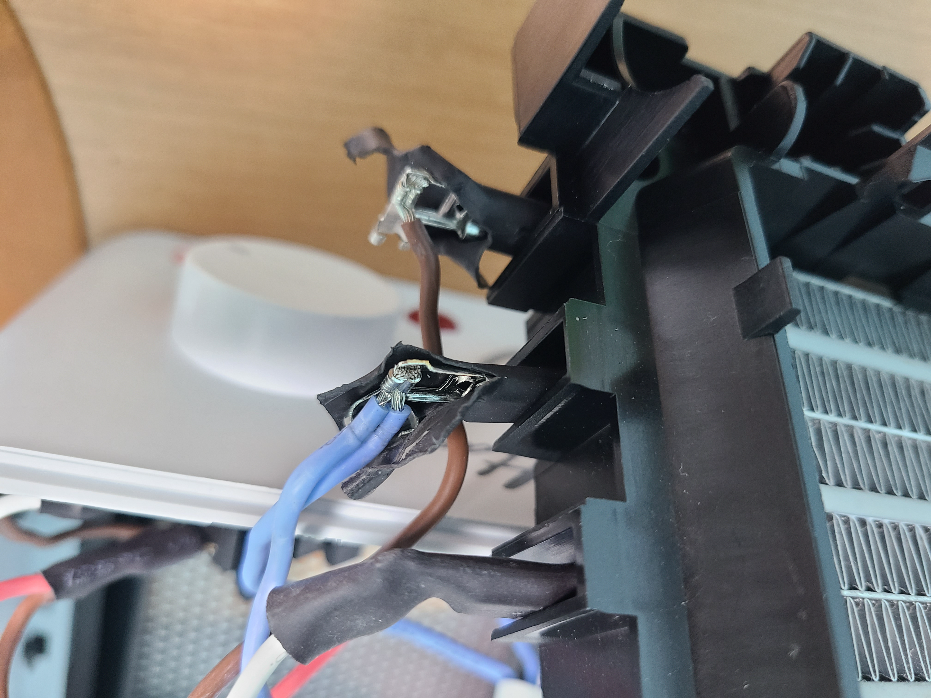 이제 본격적인 작업의 시작입니다. 1, 5번 단자가 연결된 갈색선 중 1번 단자를 분리시키고 2, 4번 중 2번을 분리시키면 됩니다. 2번은 스위치 쪽으로 연결된 배선이 함께 연결되어 있어 두 가닥 모두 분리시킵니다.