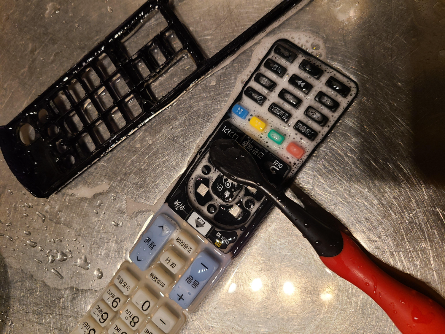 먼지 낀 전면 커버와 고무 버튼도 청소합니다.