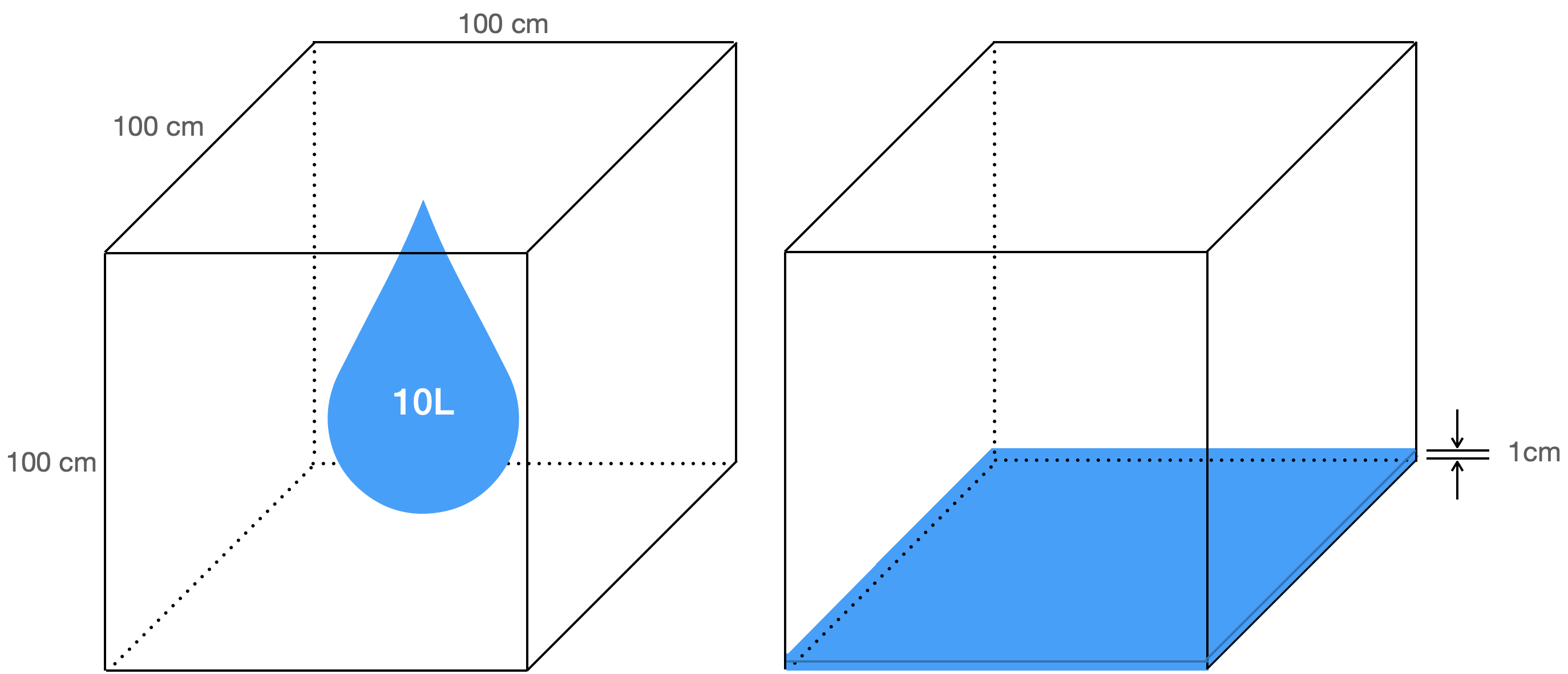 다시 말해 비가 1mm 내렸다는 건 100cm x 100cm x 100cm 부피의 수조에 0.1cm 높이로 채워졌으므로 100 × 100 × 0.1 = 1,000cc = 1 L입니다.