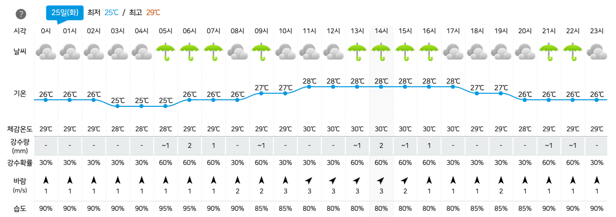 보통 기상청 동네예보를 보면 시간대 별로 강우량이 표현되니 참고하면 됩니다. 이때 시간당 3mm만 되어도 우산을 챙겨야 합니다.