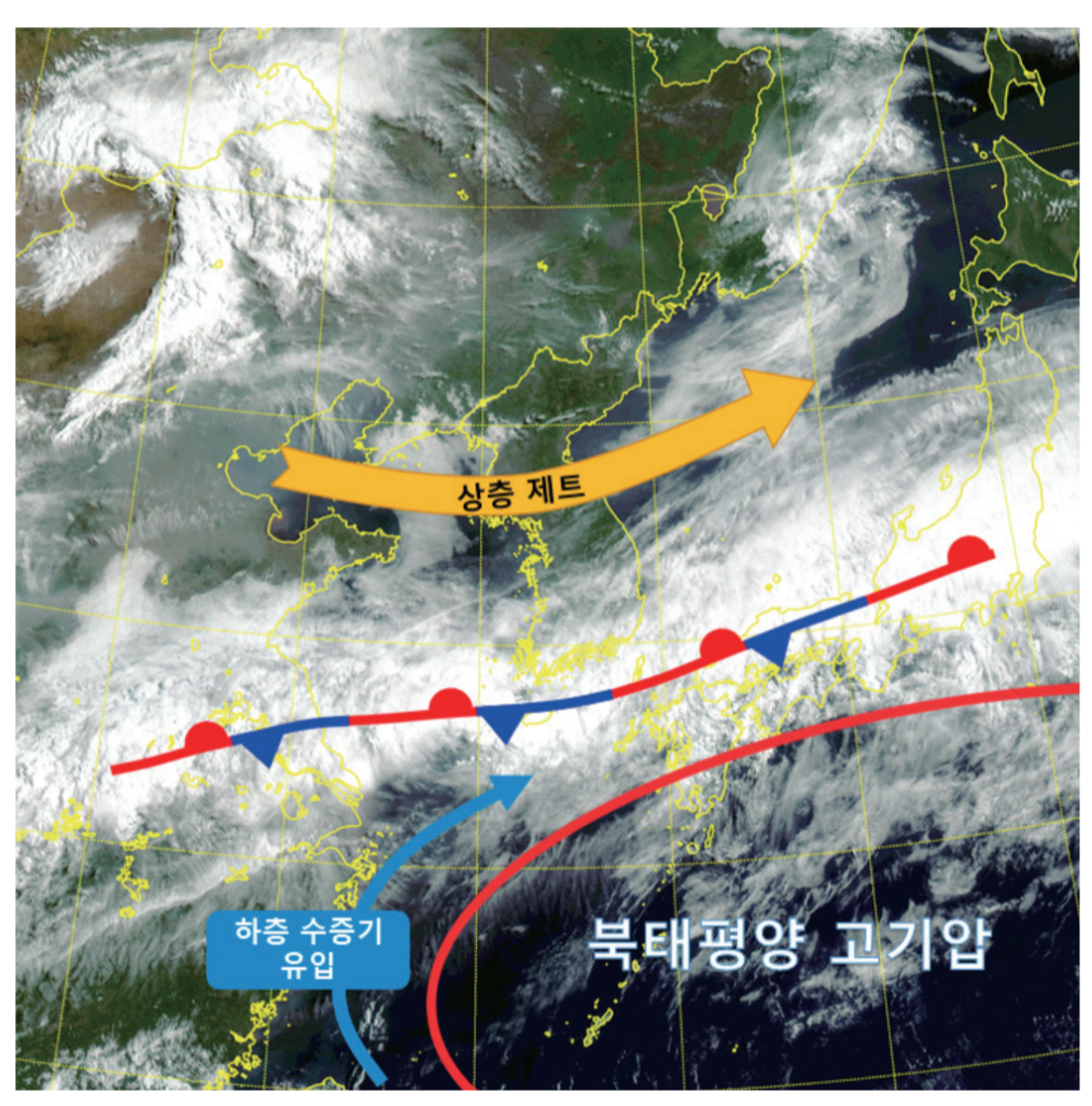 출처: 장마백서-2022, [그림1-1] 장마기간에 볼 수 있는 구름때, 정체전선, 북태평양 고기압 하층 수증기 유입 및 상승제트 분포