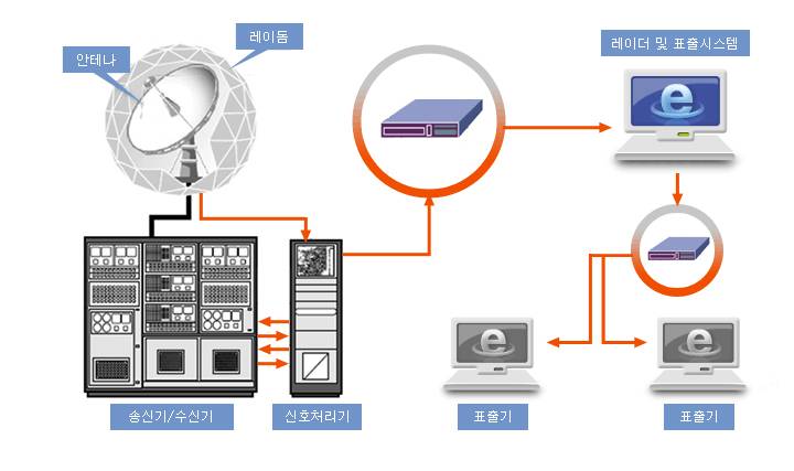 레이더 구성은 전파를 만들고 내보내는 송신기와 반사된 신호를 받는 수신기가 있고, 신호를 공간으로 내보내는 안테나와 이를 보호하는 레이돔으로 구성되어 있습니다. 그 뒤로는 수신기에서 수신된 신호를 분석하는 신호처리기를 거쳐 필요한 정보를 보여주는 표출기로 강우량을 알 수 있습니다.