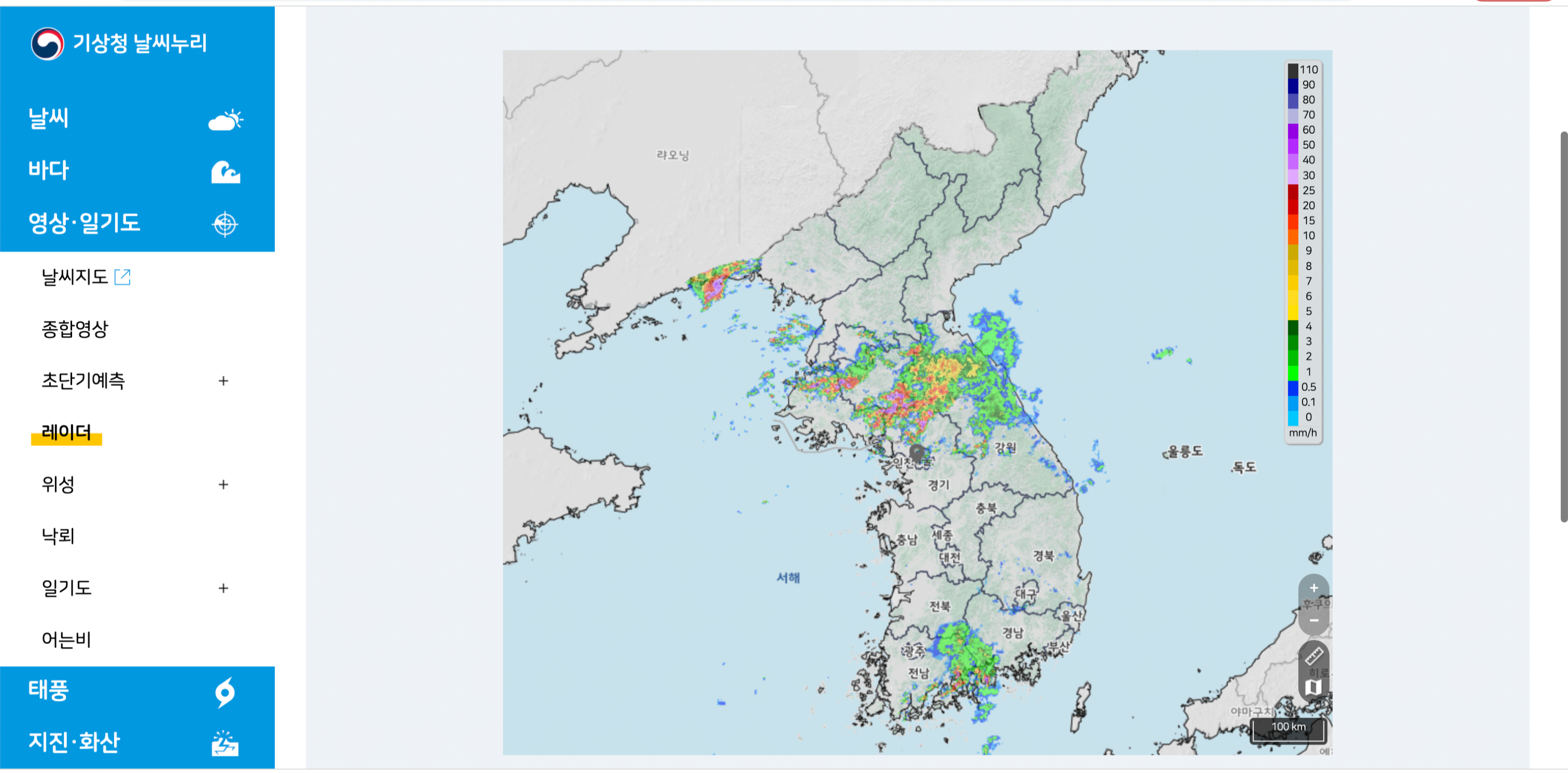 국가통계포털에서는 2013년 기준 594개소에서 강우량 관측소가 설치되어 있다고 합니다. 10년 전이니 지금은 더욱 많겠지요. 또 기상청 기상레이더는 11개, 환경부 강우레이더는 7개, 국방부 10개소 운영 중이고 레이더 자료를 실시간 공유하고 있습니다.