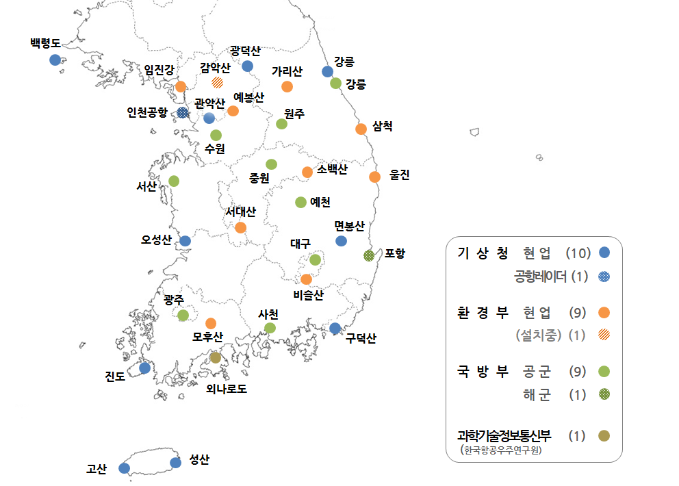 아래 지도를 보면 우리나라에 골고루 분포하고 있습니다. 여러 레이더 자료를 공동활용해서 더 정확한 관측이 이루어지고 있습니다.